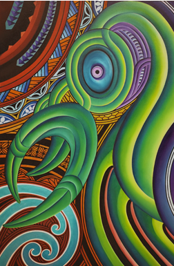 Aaron McTaggart was born in Rotorua, and is a 4th Generation artist of Māori and Pākehā descent. He has resided in Sudney for 17 years with his family. Whakapapa is a key theme in his paintings. The spiritual attachment of Maori to both their ancestral ties and the earth play an integral part in the kaupapa that defines Taggart's body of work with kowhaiwhai and koru featuring prominently.